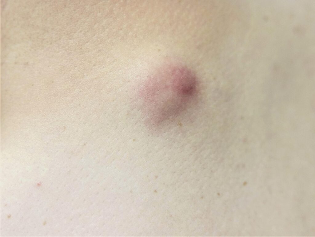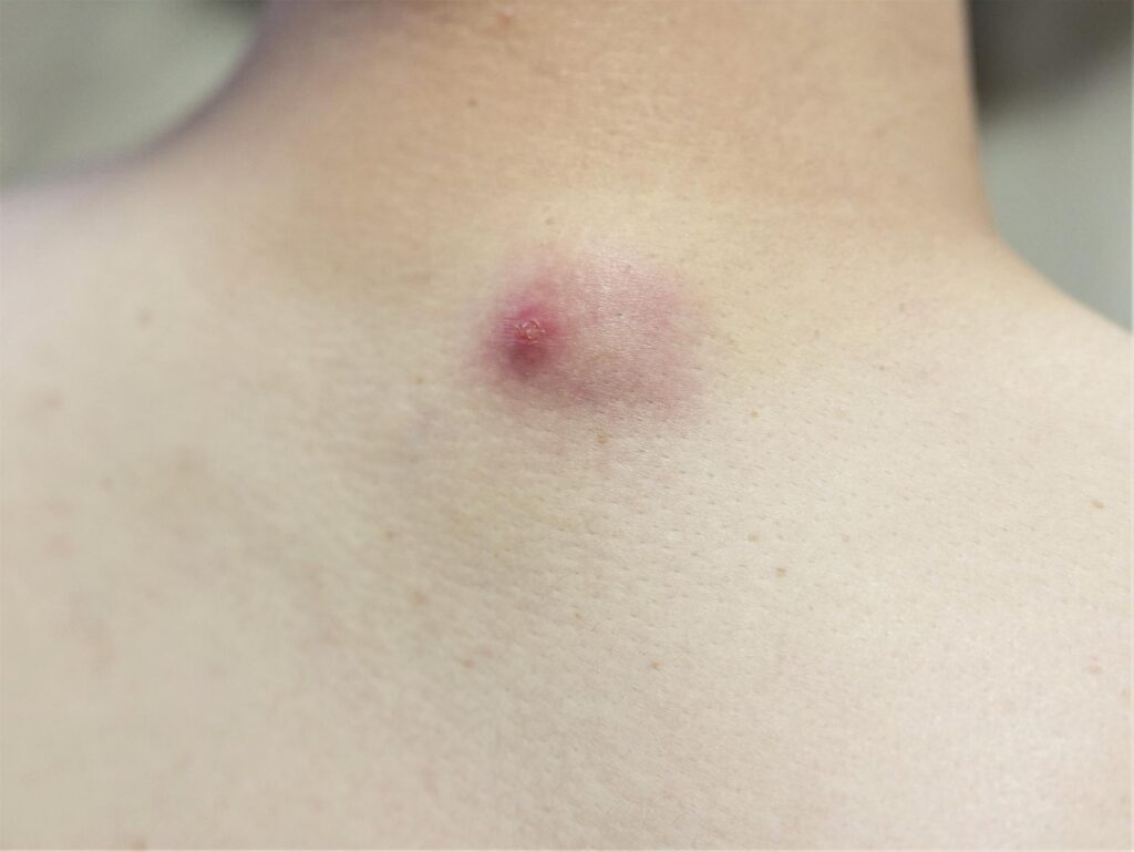 粉瘤は放置すると徐々に大きくなり、目立つサイズになる場合があります。袋の中に皮脂や角質がたまり続けるため、炎症や細菌感染を起こすと強い腫れや痛み、化膿を伴うことがあります。[2]
